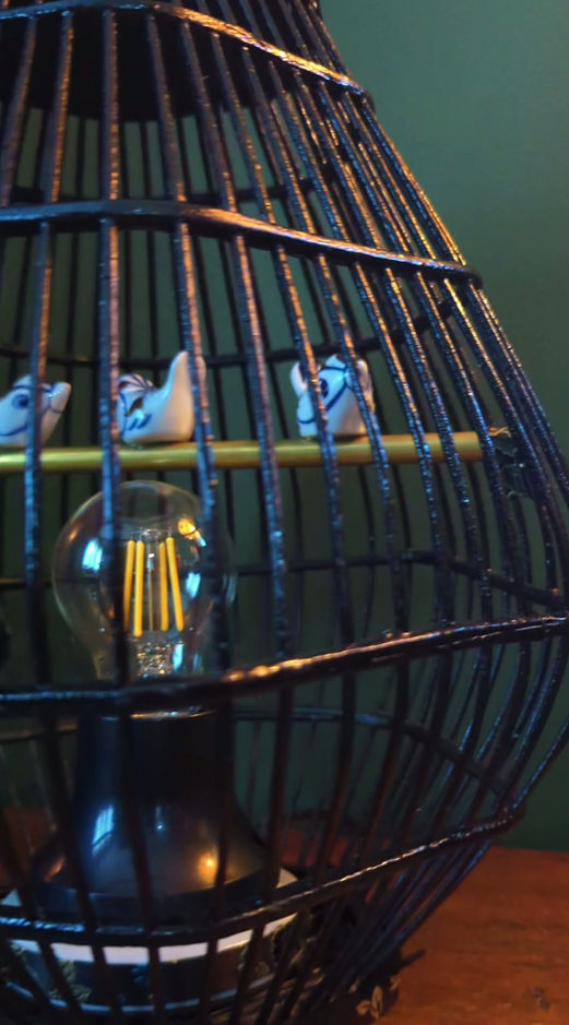 “The Aviary” is a sculptural lamp that brings together light, form, and fine detail. A warm exposed bulb sits within a curved metal cage, while three delicately placed birds rest above, creating a composition that feels both balanced and alive.